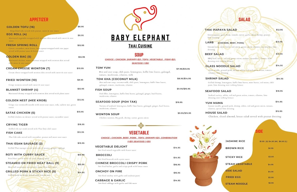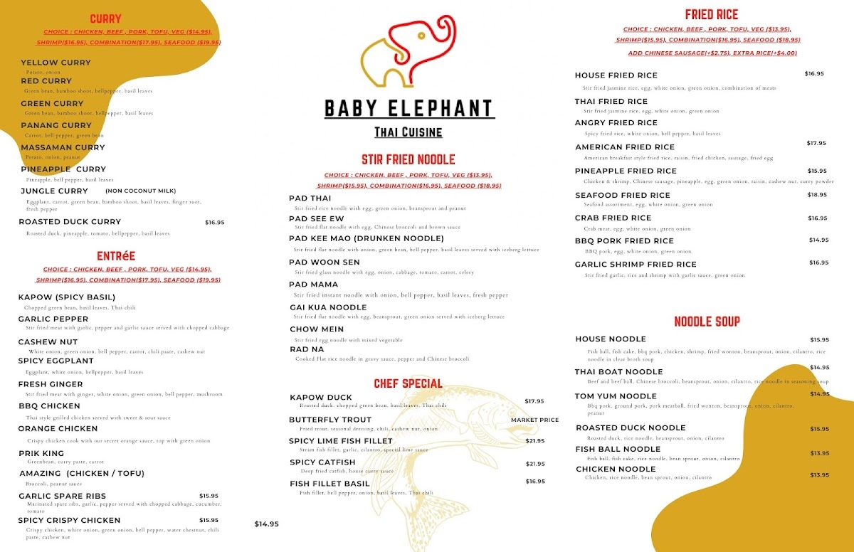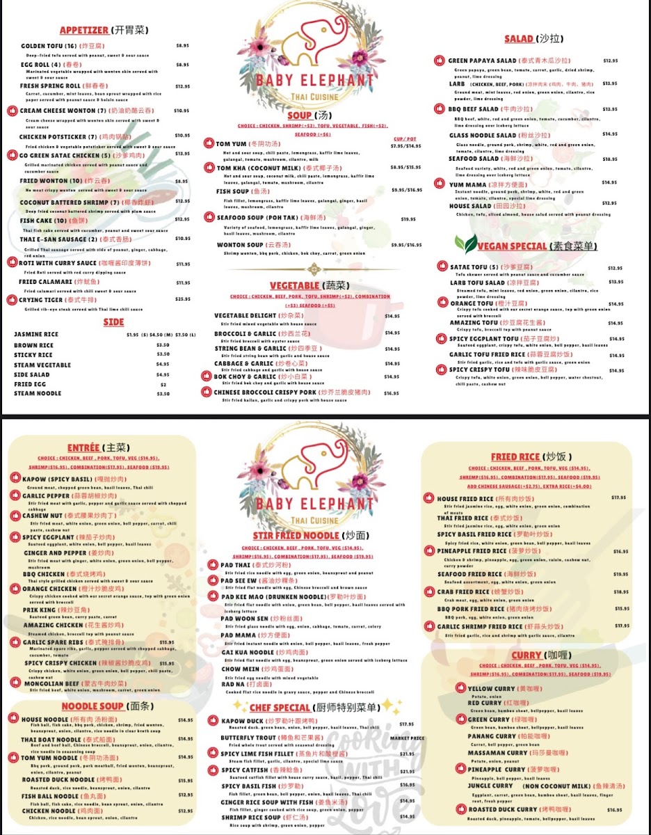 Welcome to Baby Elephant Thai Cuisine, a delightful gem located at 20795 Amar Rd, Walnut, CA 91789. This cozy Thai restaurant offers an authentic culinary experience that transports your taste buds straight to Thailand. With its warm, inviting atmosphere, Baby Elephant is not just a place to eat but a destination where each meal feels like a celebration.