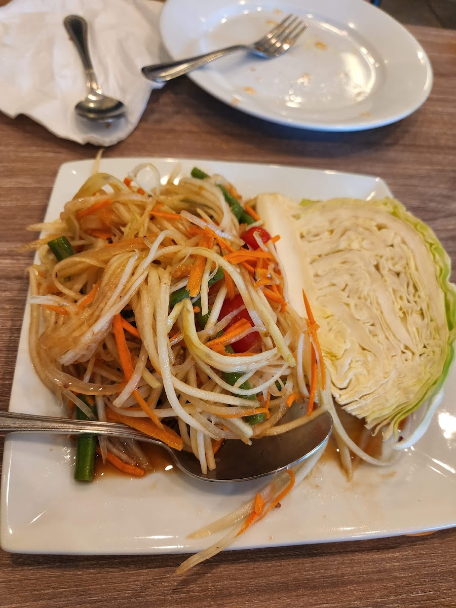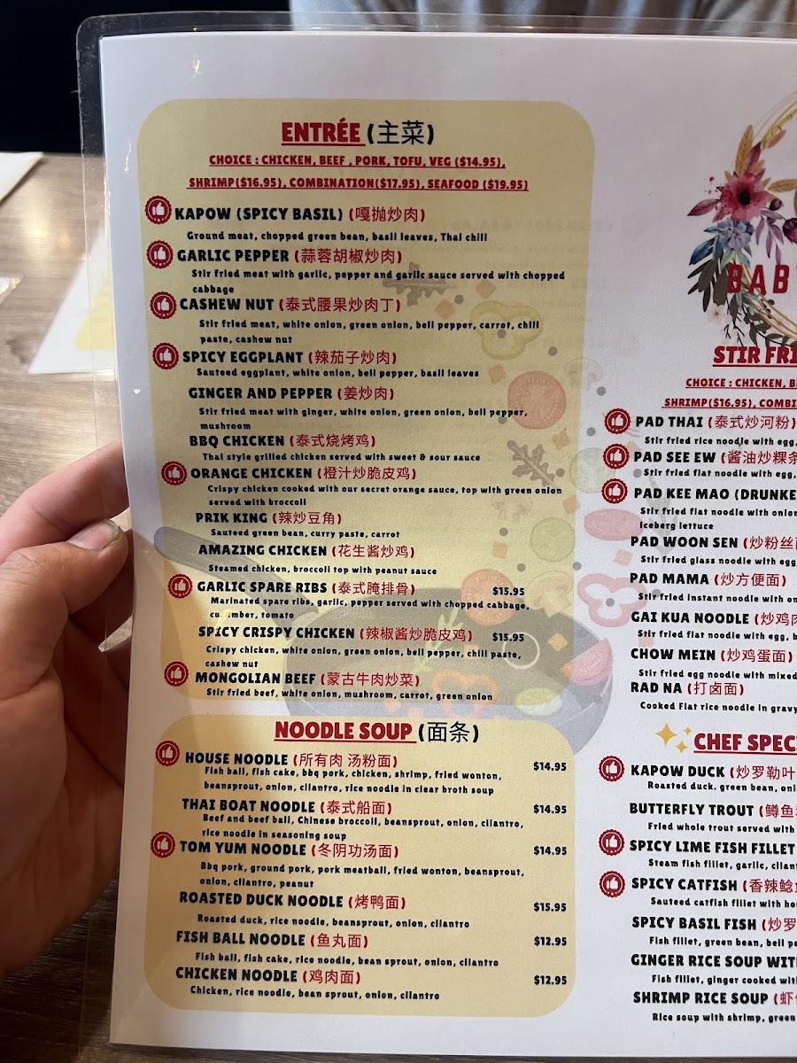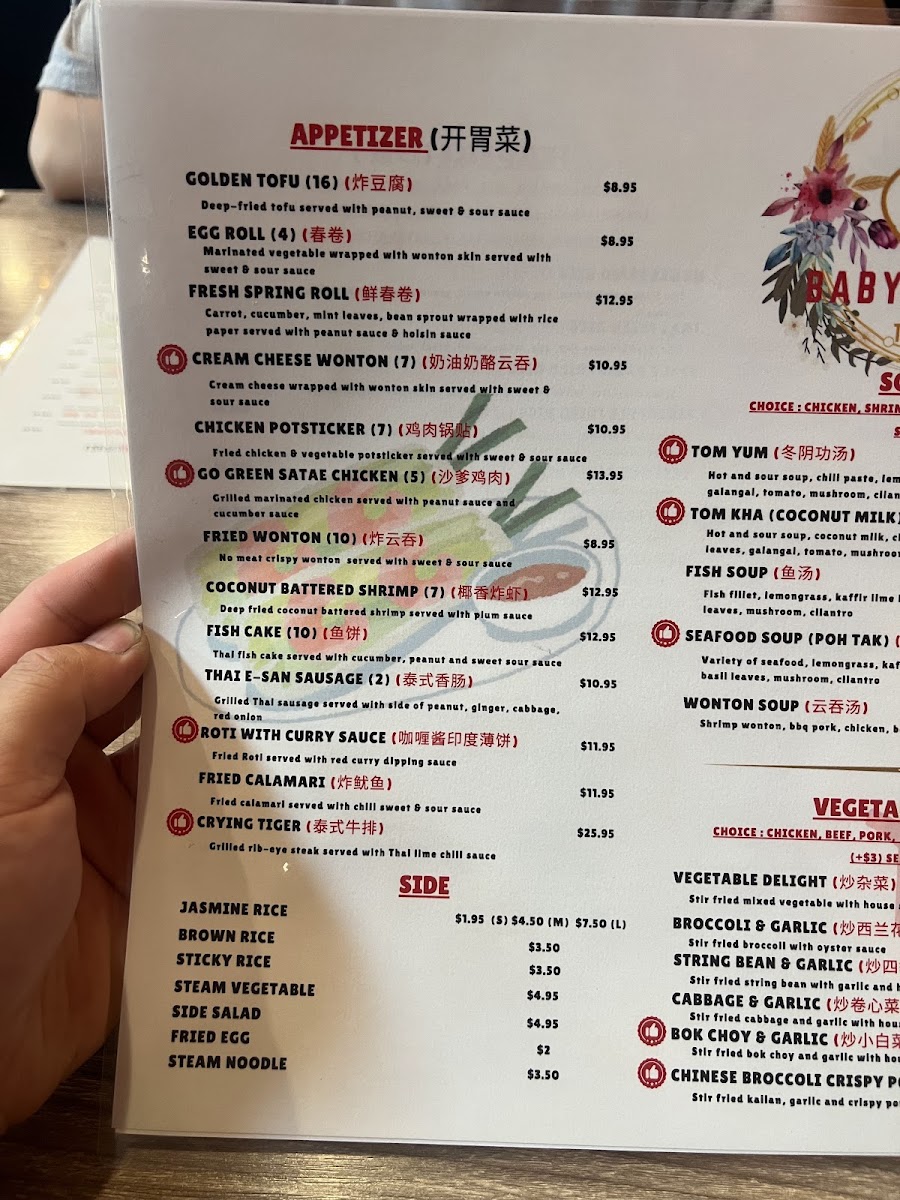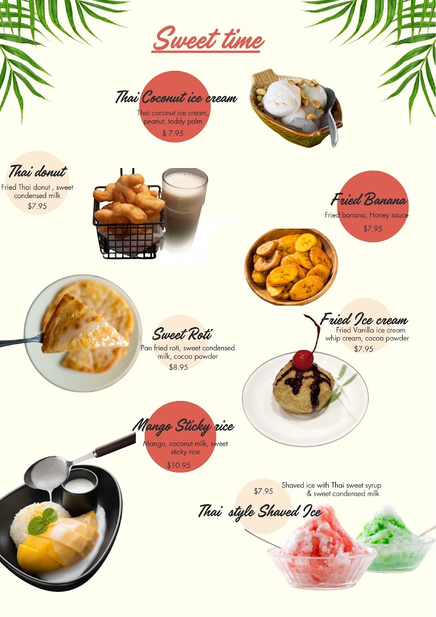 For those craving something heartier, the Spicy Crispy Chicken is a must-try; it's expertly fried to crispy perfection and coated in a robust chili paste, accompanied by a colorful array of vegetables. Vegetarians will find solace in the Spicy Eggplant, a vibrant stir-fry that tantalizes the palate with its sweet and spicy profile. Don't forget to save room for dessert—indulge in the creamy Thai Coconut Ice Cream or the decadent Fried Ice Cream, both of which provide the perfect sweet closure to your meal.